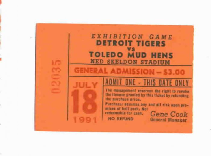 1991 Toledo Mud Hens Mudhens Vs Detroit Tigers Ticket Stub Skeldon
